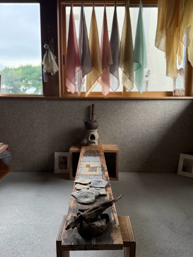広告・WEBデザイン業界を経て2004年に独立。世界各地のアートやデザインを巡り、感覚的なアートが心に与える影響を表現アートセラピーで学ぶ。ハワイ島での旅を契機に植物染色に目覚め、「風工房」氏田氏に師事し、天然灰汁発酵建を含む染色技法を習得。在来大島和棉の栽培・糸紡ぎも学び、葉山を拠点に畑で育てた植物や山の植物を用いた染色作品の制作、染レッスンや地域・学校向けワークショップ開催。